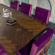 le The Oval-shaped, statement dining table is topped with high gloss finish & the natural oak-wood grain is highlighted throughout the piece. The legs are rimmed with a gold accent finish, adding to it's classical design.