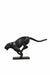 A matte grey and black polyresin sculpture of a leopard in a poised, leaping stance, paired with a wooden stand. Capturing elegance and energy, its sleek design creates a striking focal point.