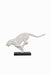 A matte grey and black polyresin sculpture of a leopard in a poised, leaping stance, paired with a wooden stand. Capturing elegance and energy, its sleek design creates a striking focal point.