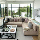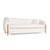 Upholstered in soft fabric, the sofa embraces rolled arms, a sheltering back and a bench seat cushion snuggled into its rounded and well-padded frame. The solid wood legs rise up to provide a warm contrast to the lustrous upholstery.