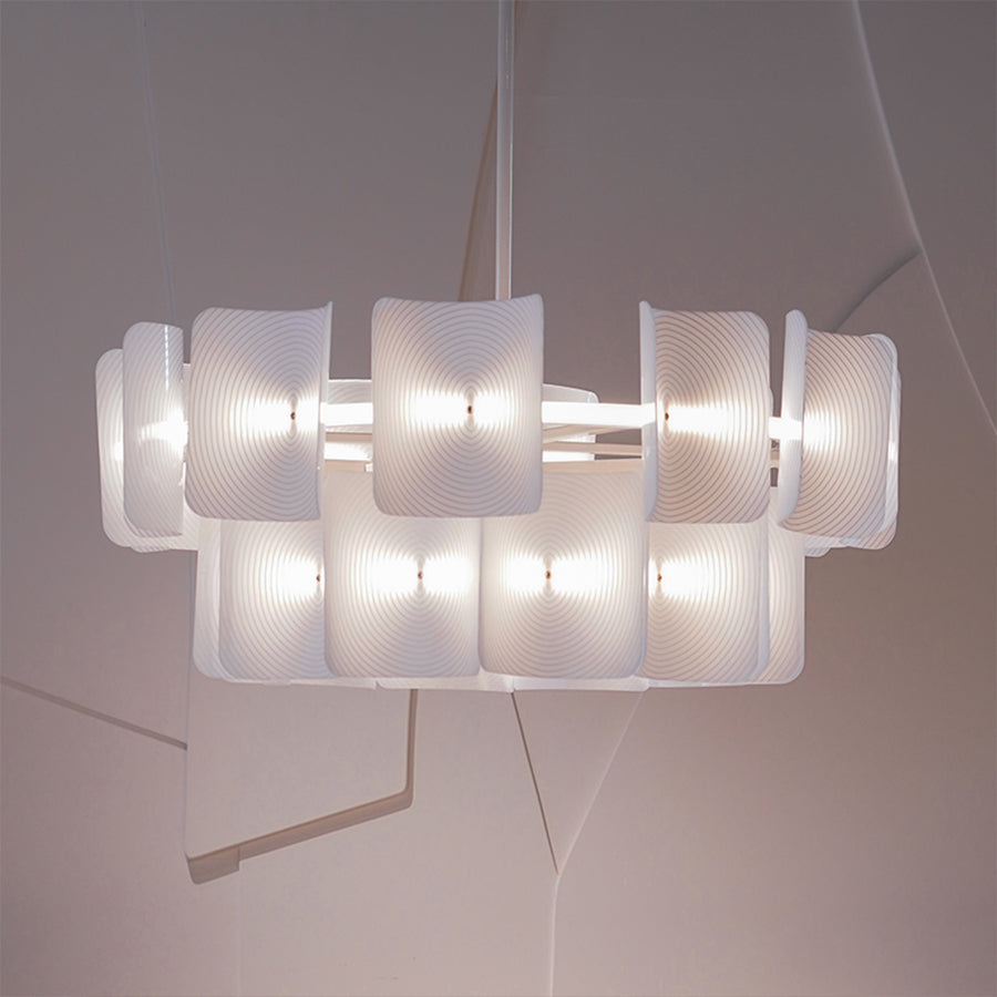 Opal ripple light features rippled beige acrylic tiles paired with a sleek white metal frame, creating a harmonious blend of texture and tone. Integrated LED lighting casts a warm, even glow, making it a refined centrepiece for dining areas, living rooms, or entryways.