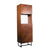 The rose-veneer cabinet stands tall with three doors that open to concealed storage. Precisely cut panels angle diagonally across each other creating an abstract chevron pattern of swirling grains. The white porcelain in the open space adds an extra oomph to the chic design.